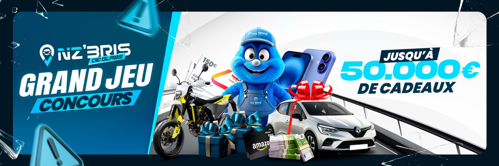 NZ’BRIS DE GLASS organise un grand jeu concours exceptionnel avec obligation d’achat, du 10 novembre 2025 au 15 janvier 2026 à minuit. En remplissant un dossier pour un remplacement de pare-brise et en faisant valider votre participation par nos équipes, vous pouvez tenter de remporter une part des 50 000 € de cadeaux mis en jeu. Le tirage au sort est réalisé sous le contrôle de la SELAS ACTA – Commissaires de Justice associés, garantissant un concours encadré et totalement transparent.